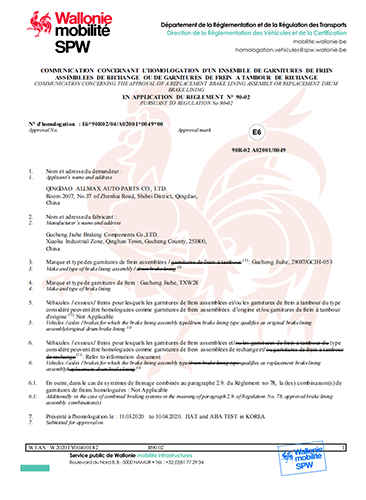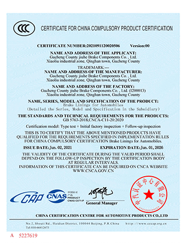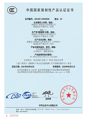 故城縣九和制動元件有限公司主導產(chǎn)品為:汽車剎車片、裝載機剎車片。剎車片采用高溫高壓的熱壓工藝、設備、生產(chǎn)線、能保證質(zhì)量穩(wěn)定,有為主機廠配套生產(chǎn)的經(jīng)驗和能力。劉如根商標是公司主要商標,公司還有飛人標牌、蛟龍牌、橫空出世等品牌!公司有多個剎車片檢驗設備,剎車片摩擦性能定速摩擦試驗機與國家非金屬礦制品檢驗中心試驗機是同公司生產(chǎn)的同型號試驗機。拖曳試驗機2020年通過中國建材檢驗集團咸陽有限公司檢驗合格,剪切試驗機;布氏和洛氏試驗機。2021年公司通過國家強制性CCC認證、通過過19001-2000idt ISO 9001:2015質(zhì)量體系認證,IATF16949認證,歐盟Emark認證。剎車片執(zhí)行GB/T11834-2011、GB 5763-2018標準。公司產(chǎn)品先后曾給山東臨工、徐工、卡特彼勒(山工)、徐州美馳車橋公司、肥城金城橋公司,山東路通橋箱科技公司,山東博士樂公司,郯城郯液公司,日照金···
